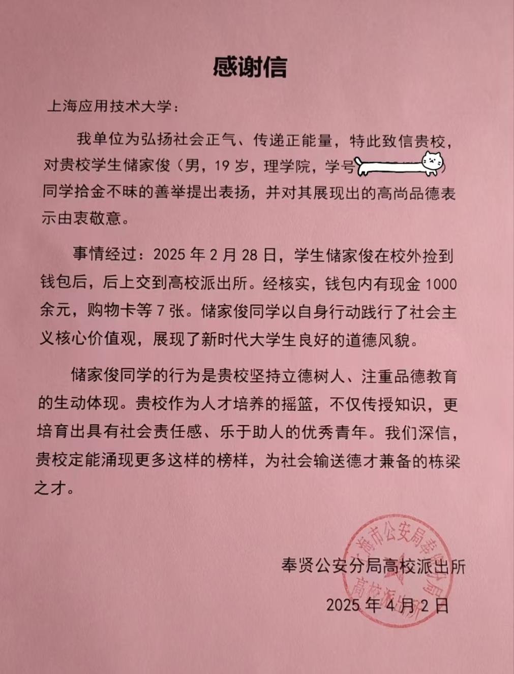 返校后储家俊立即将钱包交至高校派出所,完整叙述事件经过。一个月后,派出所联系储家俊,告知失主已找到。这一过程中,储家俊多次前往派出所配合调查,最终钱包顺利归还失主。
