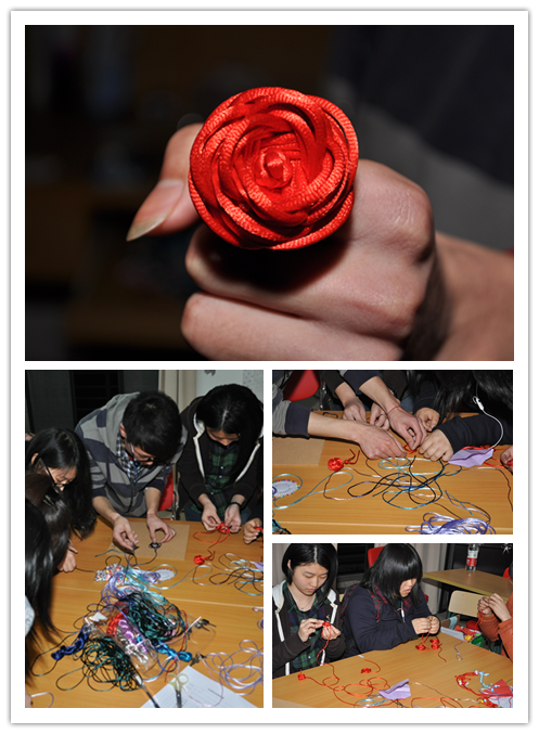 首先,社长演示给所有成员怎样制作中国结。接着,社员们在社长的带领下一步步的学习制作传统的中国结。最终,在社员的努力和社长的悉心指导下社员很快学会了如何制作“川崎玫瑰” 。并在其基础上增加自己的创意。此时,整个活动推向了高潮。社员们在学习制作传统中国结时,互相帮助、指导,展现了个人风采。个别社员的朝气蓬勃,积极向上的精神状态,感染了所有的社员。现场气氛活跃,观众情绪高涨,使活动有条不紊的进行着。最后大家还进行了制作中国结的比赛。经过激烈的角逐,最后评选出一对冠军、一对最佳人气奖。