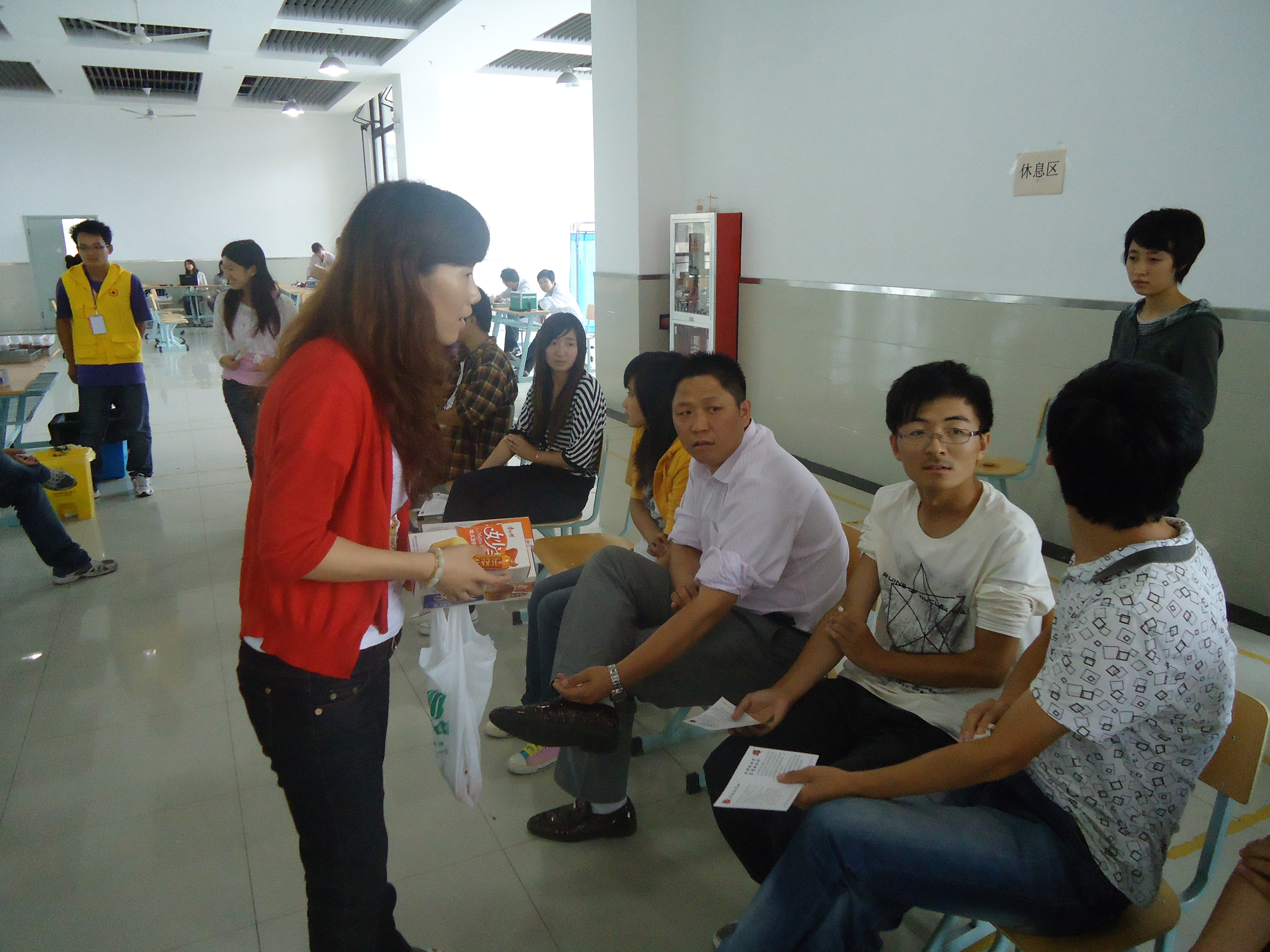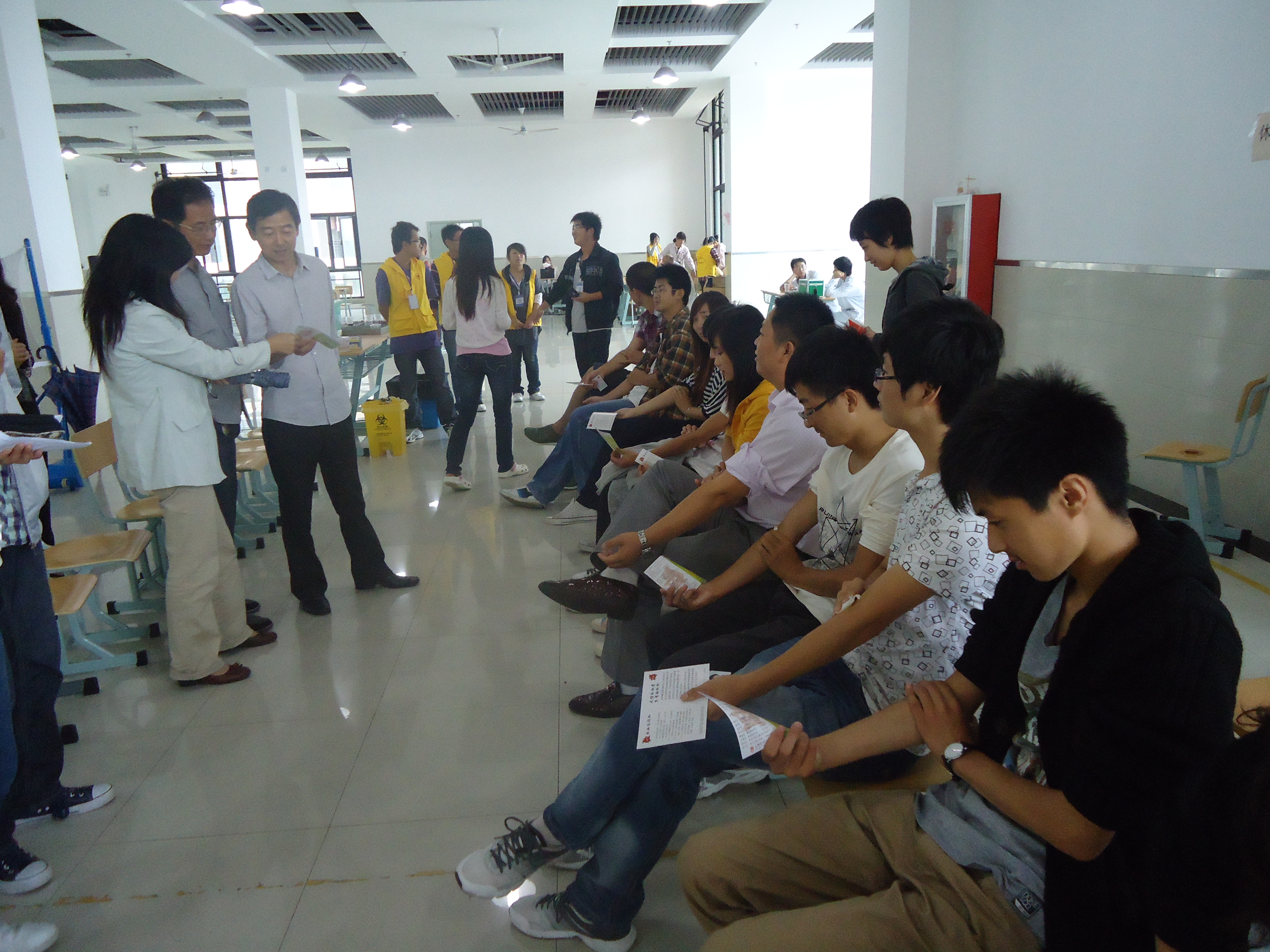 在志愿者培训讲座开始的同时,理学院的师生们也在积极的参加到献血活动中。理学院直属党支部书记王竑、工会主席周家华、学生工作负责人牛亏环及其他教师们也早早到场,为献血的16位师生们加油鼓劲,并送上营养品,缓解献血者的紧张感觉,那些亲切而关怀的话语,亲手为献血者喂上红糖水的行为,深深地打动了献血的师生和参与志愿者服务的“绿精灵”们。