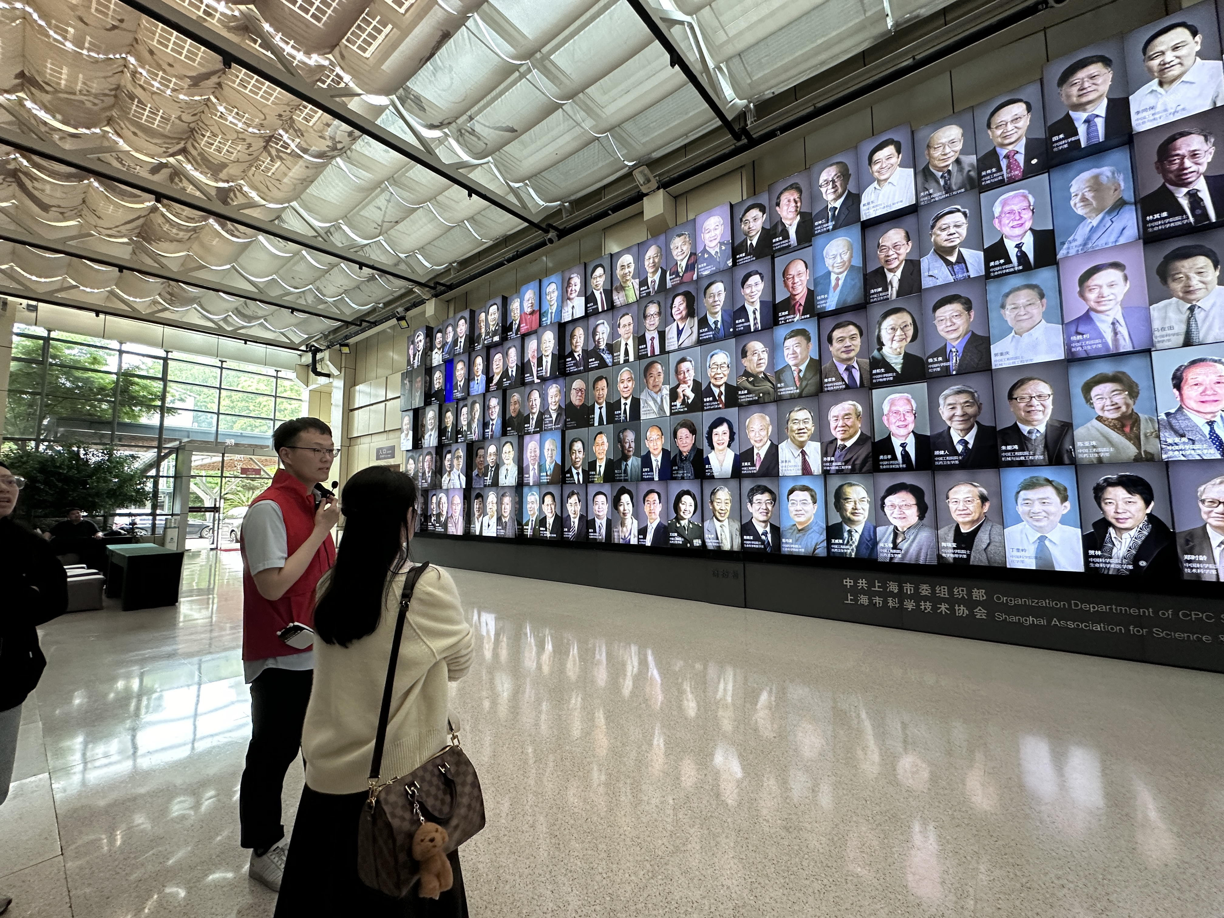 首先在院士风采多媒体展示墙前,师生们驻足学习,深入了解包括上海市科协历任主席、荣誉委员在内的280位院士的卓越成就。院士们的照片和事迹,生动展现了他们“追求真理、勇攀高峰、胸怀祖国、服务人民”的精神品格,为科研人树立了榜样。