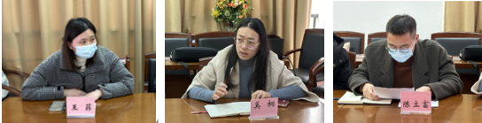 专职辅导员王菲、奚桐、陈立富分别对分管各年级学生不及格率、重点关注人群、学习困难课程等分析了学业成绩现状,存在的问题原因及加强家校协同、朋辈帮扶等举措,以及毕业班学生当前面临的毕业设计、考研复试、就业压力等方面进行了汇报。