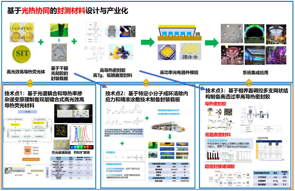 该项目经过近十年产学研用联合攻关,围绕解决微型化、系统化和集成化光电半导体模组光利用率低、导热差等问题,基于光热协同设计理念,突破封测关键材料技术难点,形成了光转换材料、塑封料、密封胶水理论创新和产业化应用等三大系列核心技术:基于光热耦合和导光导热微纳掺杂递变原理制备多层键合式高光效高导热荧光材料;基于特定小分子成环和精准涂敷技术干膜光刻胶制备多层三维载板;基于无机/有机界面调控多支网状结构制备高透过率高导热密封材料。