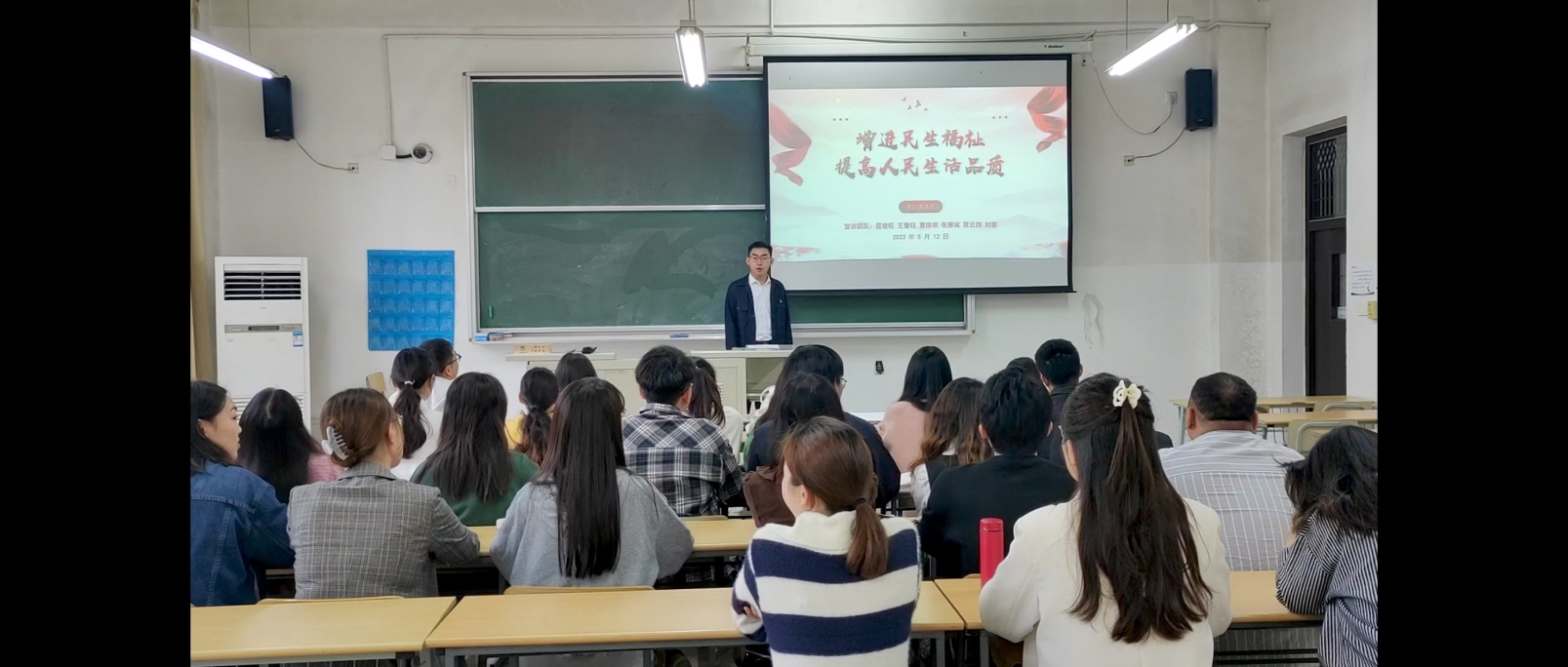 会议的第二项议程为支部副书记屈俊旺同志和党员张慧斌同志作主题汇报。屈俊旺同志的汇报主题为党的二十大报告第九章节《增进民生福祉,提高人民生活品质》。屈俊旺同志回顾并例举了国家十年来民生相关的成就与发展,详细阐述了完善分配制度、实施就业优先战略、健全社会保障体系、推进健康中国建设主题相关的工作部署。最后他表示研究生党员应积极阅读,补足精神之钙,用行动践行誓言,发挥榜样作用。