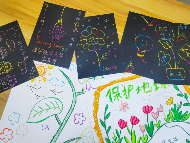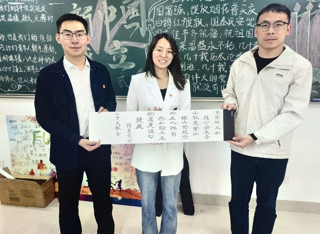 理论学习结束后,支部成员有感而发,动手实践。通过写字、绘画等具体的行为表达青年的朝气。党员同志摘抄党的二十大报告金句表达对国家的热爱,写下福字表达对人民的祝福,绘画绿色图景表达对美好生活的向往。