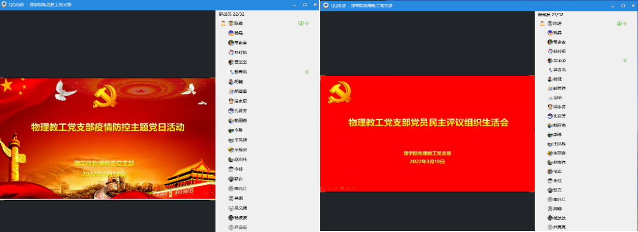 近日,理学院物理教工党支部于线上开展了疫情防控主题党日活动暨民主评议组织生活会。支部全体党员出席了本次会议,会议由支部书记陈进主持。