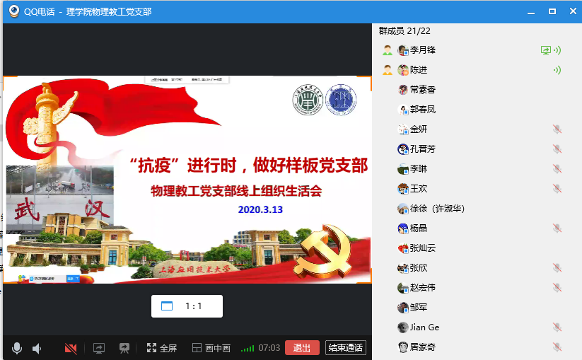 3月13日,理学院物理教工党支部利用“云端”平台,举行了一次别开生面的线上组织生活会。理学院党总支书记陈勇、支部教师党员出席了本次生活会,会议由物理教工支部书记李月锋主持。