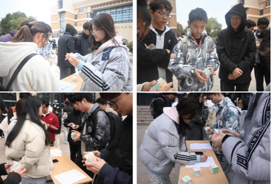 紧接着来到会场三——数你最牛“π”。参赛者需在规定的三分钟时间内成功还原三阶、四阶魔方即可得到相应分数。现场的同学们或手法敏捷,令人眼花缭乱或有条不紊,叫人捏一把汗,五彩的魔方在指尖扭动,数理的思维在脑海应用!