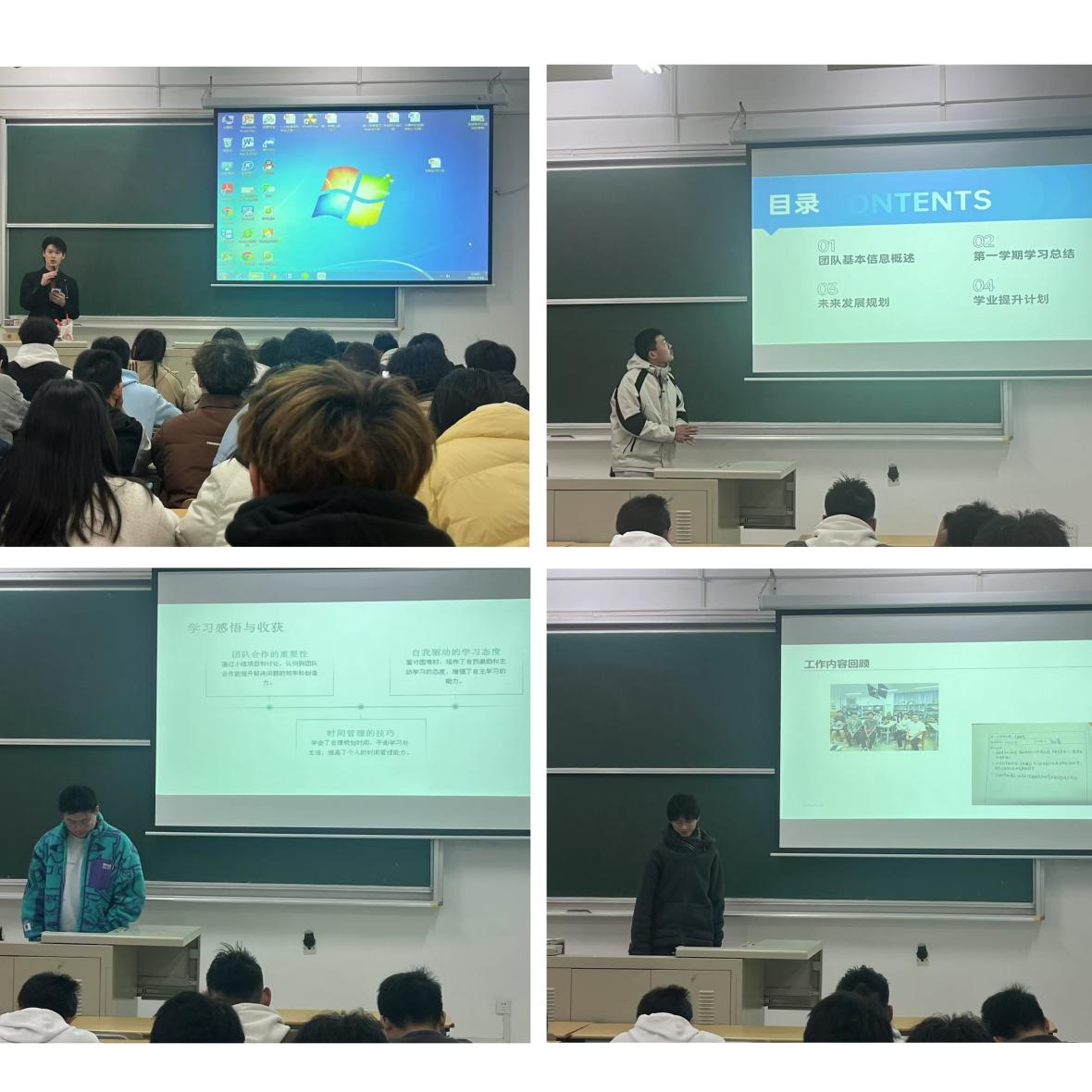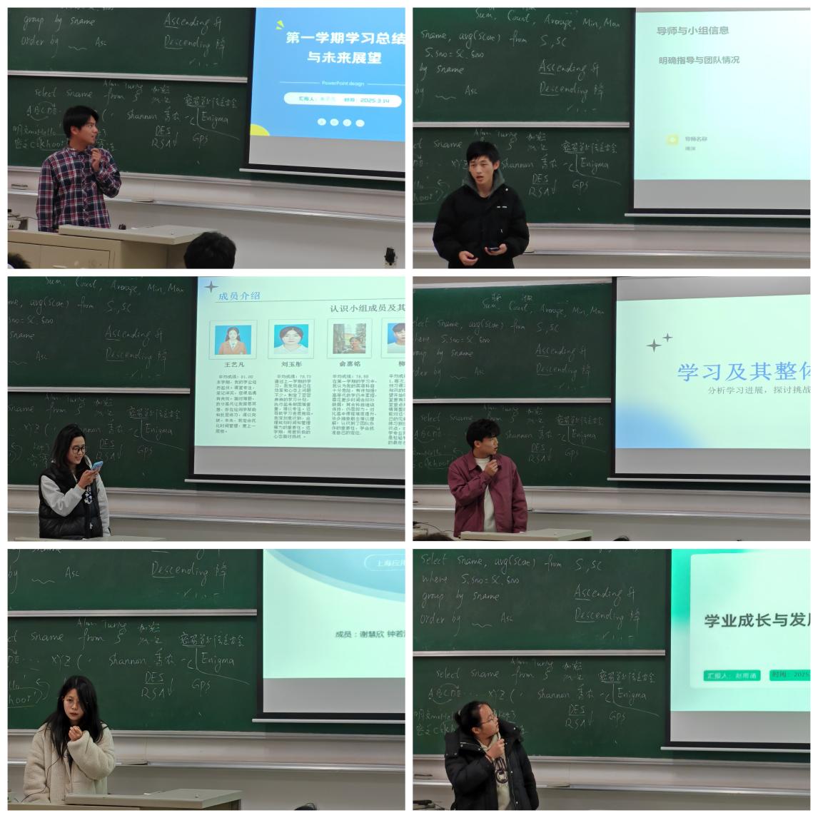 各个导师带领的小组推选代表上台汇报上学期学习生活情况,分享专业学习难点及解决措施,展示本小组未来学习规划,并跟导师约好会后交流。