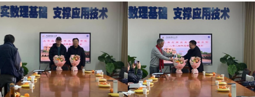 会议伊始青年教师为退休老师们献上鲜花,以此表达对前辈们的敬意!欢送会上,喜气洋洋、情意浓浓,院长李以贵送上了理学院的礼物,感谢他们辛苦的付出!