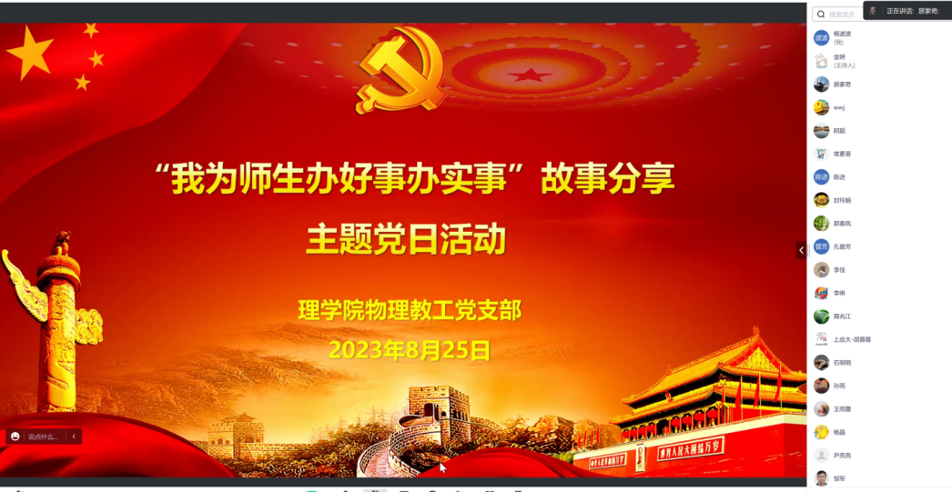 为深入开展学习贯彻习近平新时代中国特色社会主义思想主题教育,以高质量党建引领推动高校为党育人为国育才、实现高质量发展,进一步激发党员立足岗位做先锋,践行宗旨服务群众,825日,理学院物理教工党支部开展“我为师生办好事办实事”故事分享主题党日活动,活动由支部书记金妍主持。