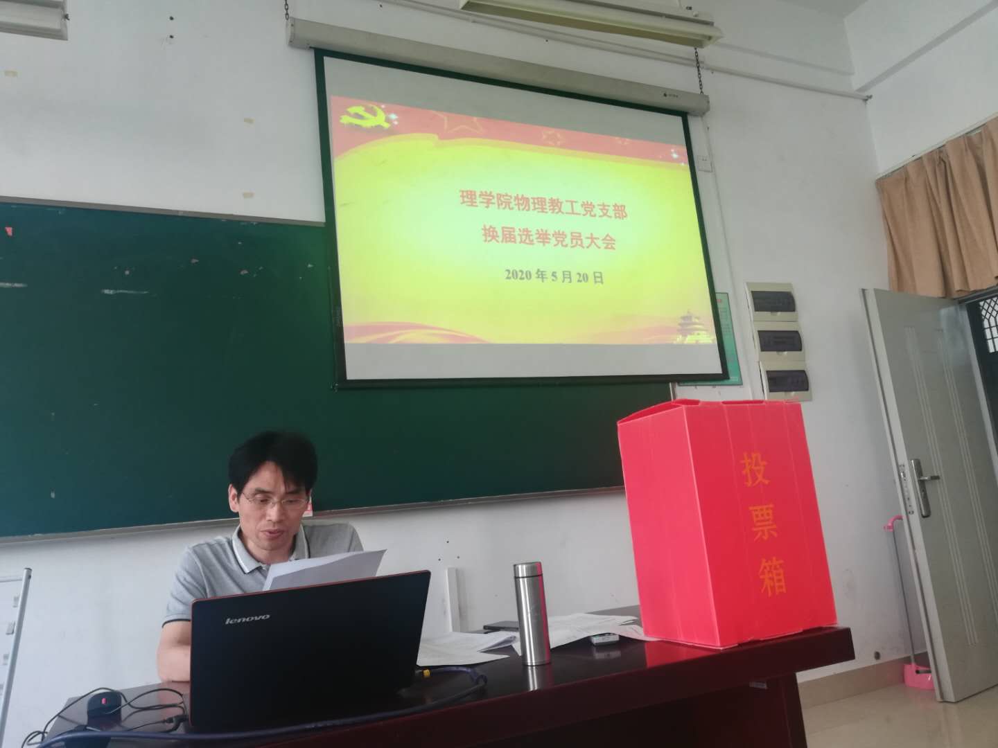 5月20日,理学院物理教工党支部在第四学科楼235会议室,召开了换届选举党员大会,理学院党总支书记陈勇、支部教师党员出席了本次会议,会议由物理教工支部书记李月锋主持。