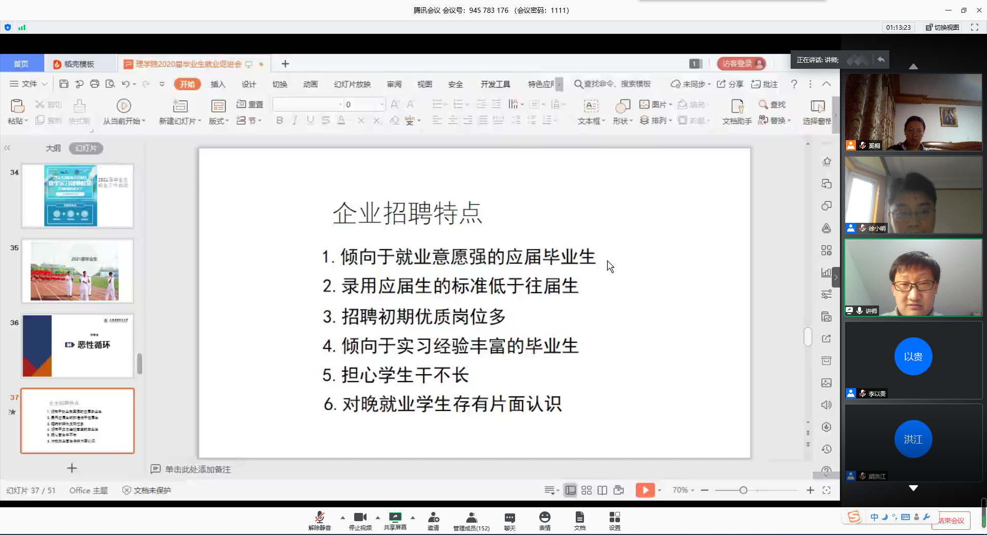 傅晓龙老师从提高简历质量、当前形式的极端严峻性、就业的刻不容缓和晚就业的恶性循环四个方面讲述了今年的就业趋势以及就业要点。他建议同学们调整心态,降低期待,开阔视野,提早就业。让同学们意识到了就业的重要性以及当前就业的机遇和挑战。随后,胡洪江老师从工作态度、学习能力、团队协作、动手能力方面分析了用人单位的需求,希望同学们规划好人生,得到了同学们的一致赞同。
