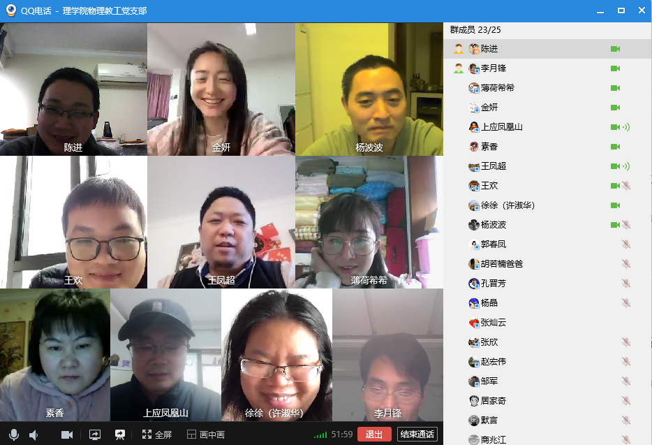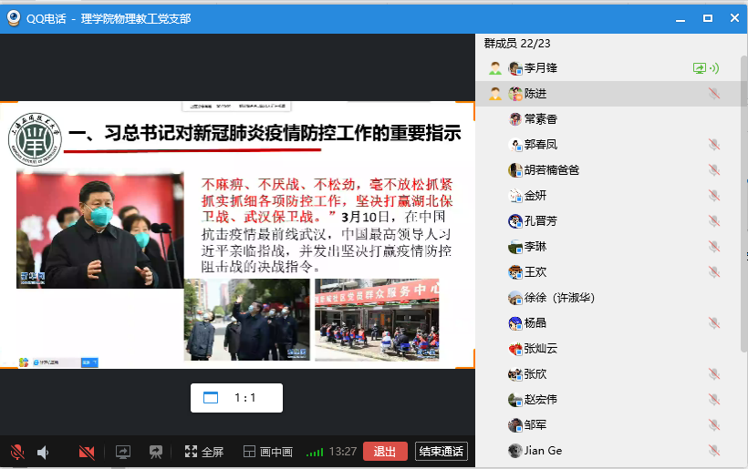 3月13日,理学院物理教工党支部利用“云端”平台,举行了一次别开生面的线上组织生活会。理学院党总支书记陈勇、支部教师党员出席了本次生活会,会议由物理教工支部书记李月锋主持。