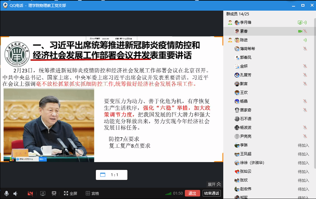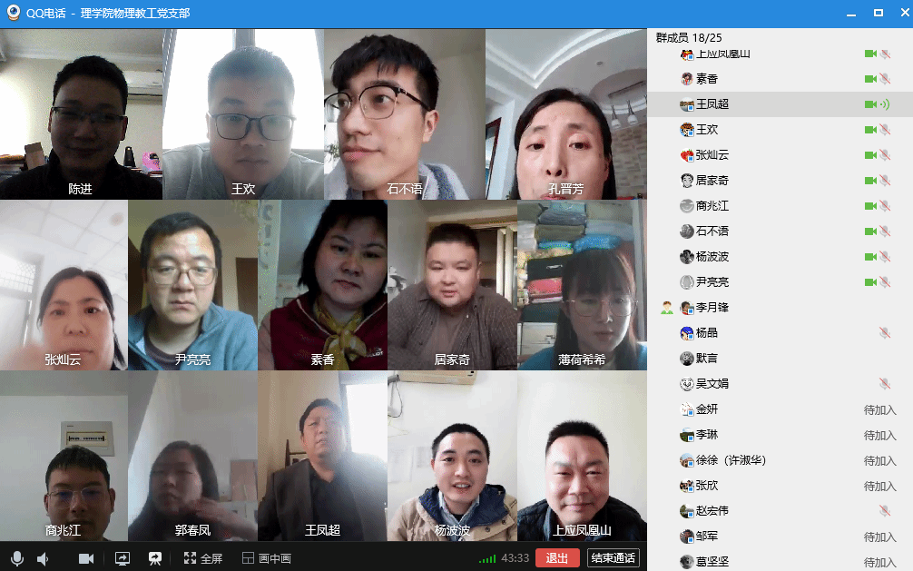 4月24日,理学院物理教工党支部利用线上平台举行组织生活会。理学院党总支书记陈勇、支部教师党员出席了本次生活会,会议由物理教工支部书记李月锋主持。