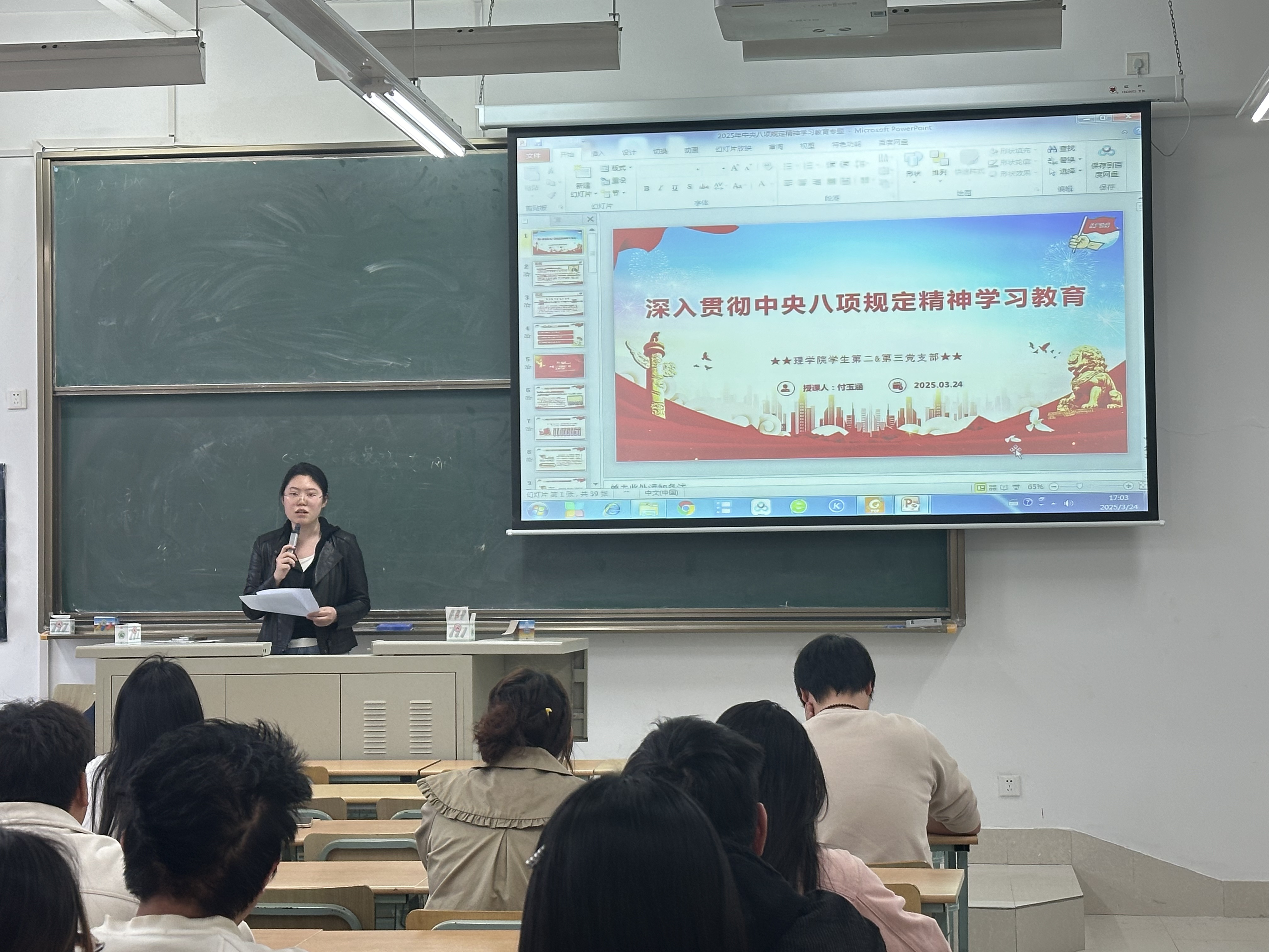 2025年3月24日,理学院学生第二、第三党支部联合举办“深入贯彻中央八项规定精神”专题党课,旨在引导全体党员深刻领会中央八项规定精神的内涵实质,切实增强廉洁自律意识,筑牢拒腐防变的思想防线。学生第二党支部书记付玉涵老师带领全体研究生党员开展学习教育。